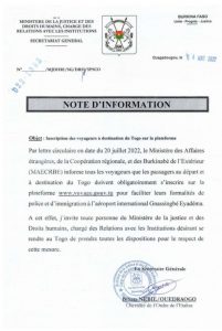 Après le ministère des affaires étrangères, de la coopération régionale et des Burkinabè de l’extérieur, c’est autour du ministère de la justice, des droits humains, chargé des relations avec les institutions d’inviter ses agents à s’inscrire sur la plateforme www.voyage.gouv.tg pour leur voyage.